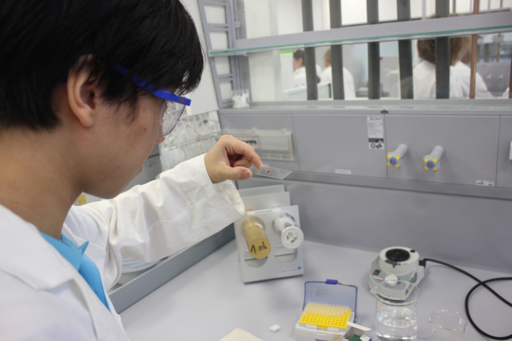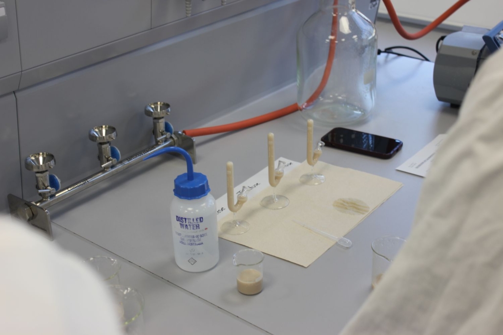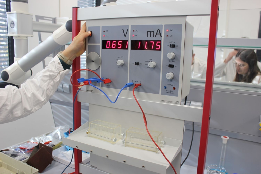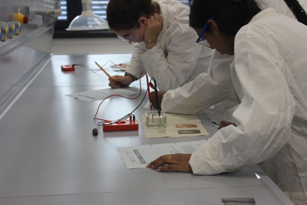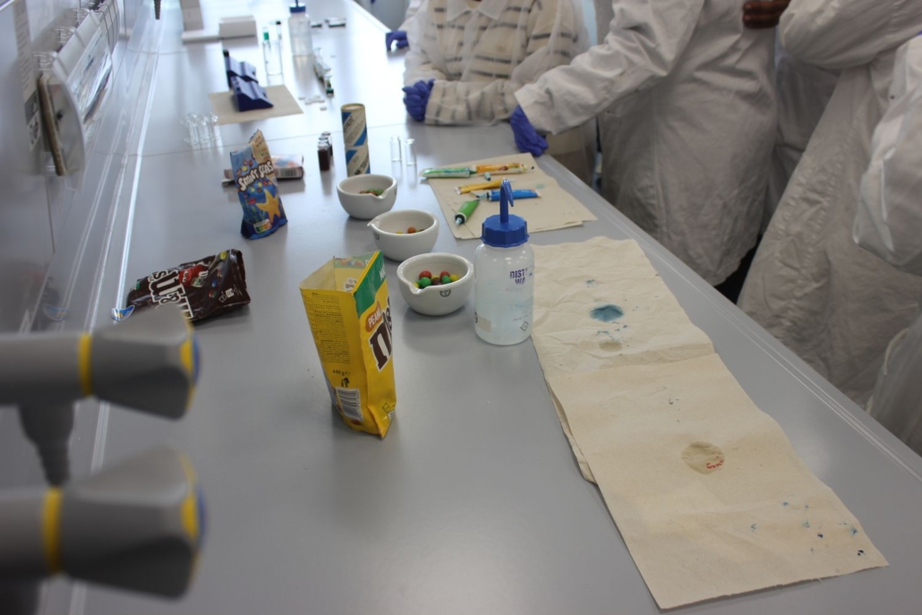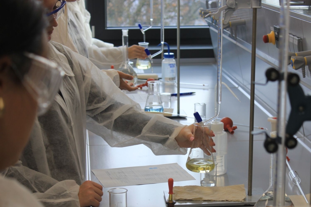 Auch in den Chemie- und Physiklaboren warteten vielfältige Versuche: Die Jugendlichen bestimmten beispielsweise den Säuregehalt von Haushaltsessig, untersuchten den Zuckergehalt einer Limonade, analysierten Metallverbindungen in der Flamme oder spürten Lebensmittelfarbstoffen mittels Dünnschichtchromatographie nach („Willy Wonkas Geheimzutat“). Ergänzt wurde das Programm durch Stationen zu Wasserstoff als möglicher Energiequelle der Zukunft und zu elektrochemischen Spannungsquellen.