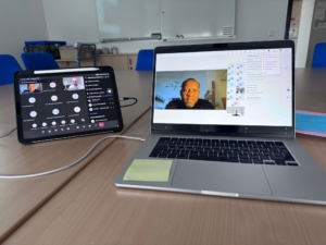 Freddy Ndongbou, unser Sprachbegleiter, der die Gruppe im November begleiten wird und Kolleg:innen und Schüler, die nicht Vorort sein konnten, schalteten sich per MSTeams dazu.