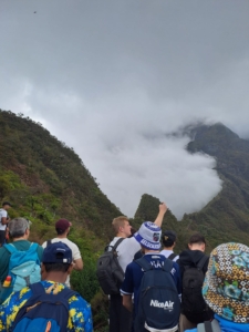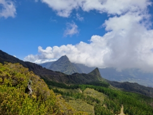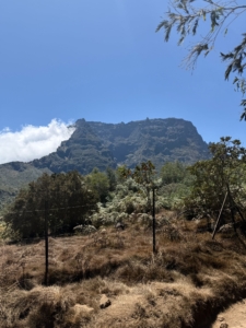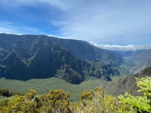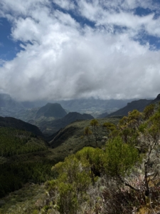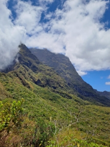 Das Ziel: Der Berg Mafate, genauer gesagt ein kleines Dorf im Tal. Um 6:30 Uhr holten uns die französischen Lehrer ab. Es folgte eine Fahrt von ca. 1,5 bis 2 Stunden bis zu einem Parkplatz in den Bergen. Ab da mussten wir zu Fuß weiter. Nach einem kurzen Anstieg hatten wir schon den höchsten Punkt unserer Wanderung erreicht. Oben vom Berg hatte man einen fantastischen Ausblick auf das Tal und die weite Landschaft. Von diesem Punkt an gingen wir etwa eine Stunde bergab, bis wir eine Lichtung erreichten.