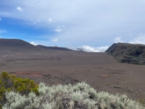 Die asphaltierte Straße endete, und über einen Schotterweg kamen wir nach 5 ewig langen Kilometern am Parkplatz vor dem Krater an. Hier oben auf 2354m war es mit 16° recht kühl.