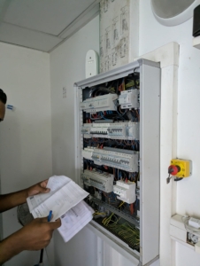 Wir kontrollierten, ob die elektrischen Anlagen richtig funktionieren. Erstmal haben wir die Unterverteilung aufgemacht und geputzt, mögliche Fehler gesucht, und getestet, ob die Notbeleuchtung bei Stromausfall angeht.