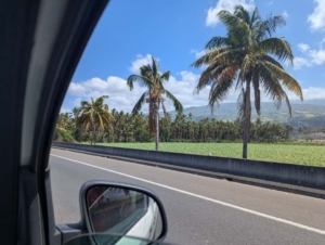 Durch die lange Fahrt und die Staus an der Autobahn, war es schließlich Zeit, Feierabend zu machen. Auf der Fahrt zurück nach St. Denis sah ich ein Zuckerrohrfeld, das von Kokospalmen umgeben war.