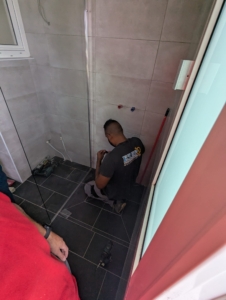 Dieses Wohnhaus wird gerade renoviert und unsere Firma soll das Bad und die Elektrik erneuern. Somit haben wir als erstes eine Lampe ausgetauscht und Lichtschalter eingebaut. Als Letztes haben wir eine Duschtrennwand aus Glas eingebaut – das erste Mal, dass ich (Elektroniker für Betriebstechnik) so etwas mache.