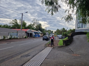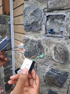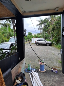 Unser Ziel war ein Kunde in Richtung Salazie, rund eine Stunde Fahrt entfernt. Gegen 10:00 Uhr kamen wir dort an und verschafften uns zuerst einen Überblick. Der Kunde hatte einen besonderen Wunsch: Er wollte draußen einen Beamer aufstellen und benötigte deshalb mehrere Steckdosen für den Beamer und seine Streaming-Geräte.