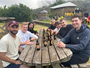 Nach dem gemeinsamen Abendessen mit allen Lehrern und Schülern, wollten einige von uns nochmal zur Berghütte zurück, doch diese hatte bereits geschlossen. Wir wollten gerade heim gehen, als wir auf einmal Geräusche vernahmen, die wie laute Musik klangen. Da es so nebelig war, konnten wir nichts sehen und folgten einfach unsere Ohren. Was sich anhörte wie eine Disco, entpuppte sich als kleiner Kiosk, in dem ein paar Leute Kicker spielten. Innerhalb von wenigen Minuten nach unserer Ankunft füllte sich plötzlich der Kiosk und alle begannen zu tanzen. Wir hörten kreolische Musik und feierten bei ausgelassener Stimmung zusammen mit den Dorfbewohnern und anderen Wanderern. So fand dieser aufregende Tag seinen krönenden Abschluss.