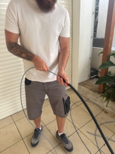 Heute waren wir bei einem Kunden, um drei Überwachungskameras zu installieren. Dafür haben wir CAT7-Leitungen verwendet, die sowohl in Rohren als auch in Kabelkanälen verlegt wurden.